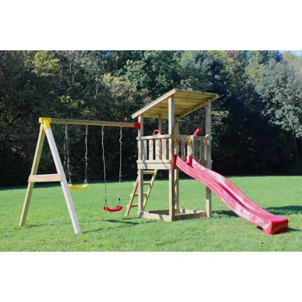 A kerti játszóterek faanyagai minden esetben magas nyomáson telített, impregnált borovi fenyőből készülnek. A telítéshez használt zöldes árnyalatú impregnálószer védi a fát, ugyanakkor, hogy hosszú távon megvédjük a fa minőségét, mindenképp érdemes felületi kezelést, lazúrozást adni a faanyagnak.
