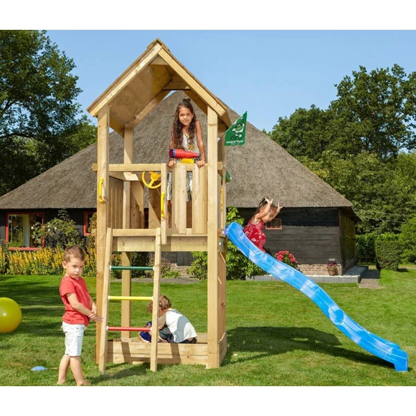 Fatetős torony homokozóval. Kifejezetten kis kertekbe ajánljuk.