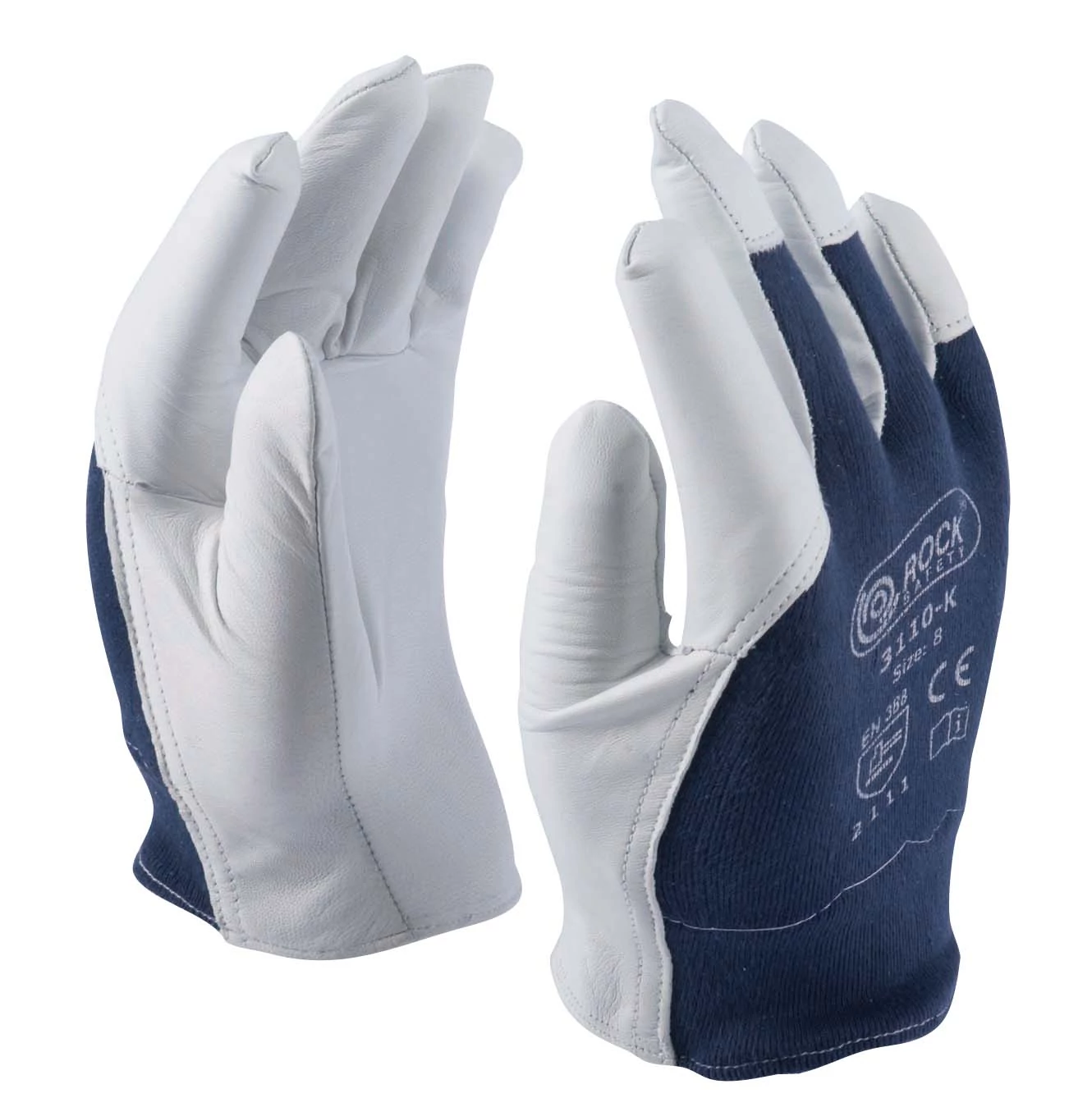 • Kecske színbőr tenyér-, köröm- és érvédő • Kék pamut kézhát • Bőrszín: törtfehér