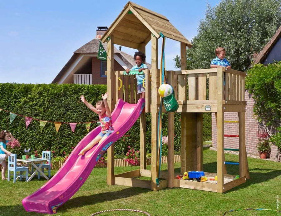 Egy lenyűgöző játék torony, fa tetővel és két padozattal, lehetővé téve, hogy egyszerre homokozót és piknik asztalt is építhess alá. Az extra padozathoz erősítve mászófal található, így eldöntheted, hogy létrán mászol fel és le, vagy a falon.