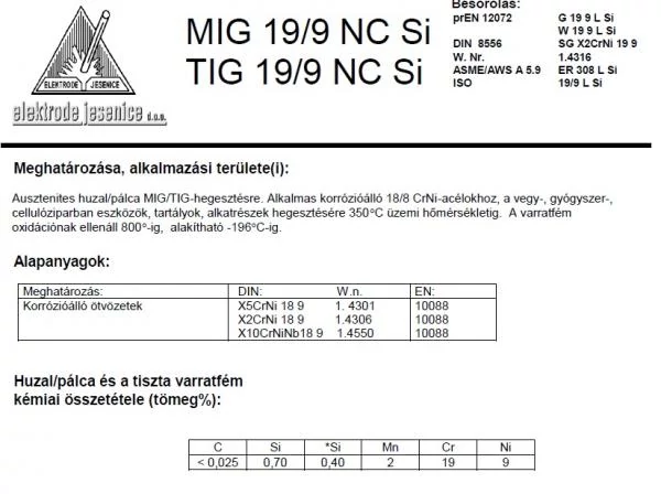 Lángpálca TIG 19/9 NC SI 2.0/1000