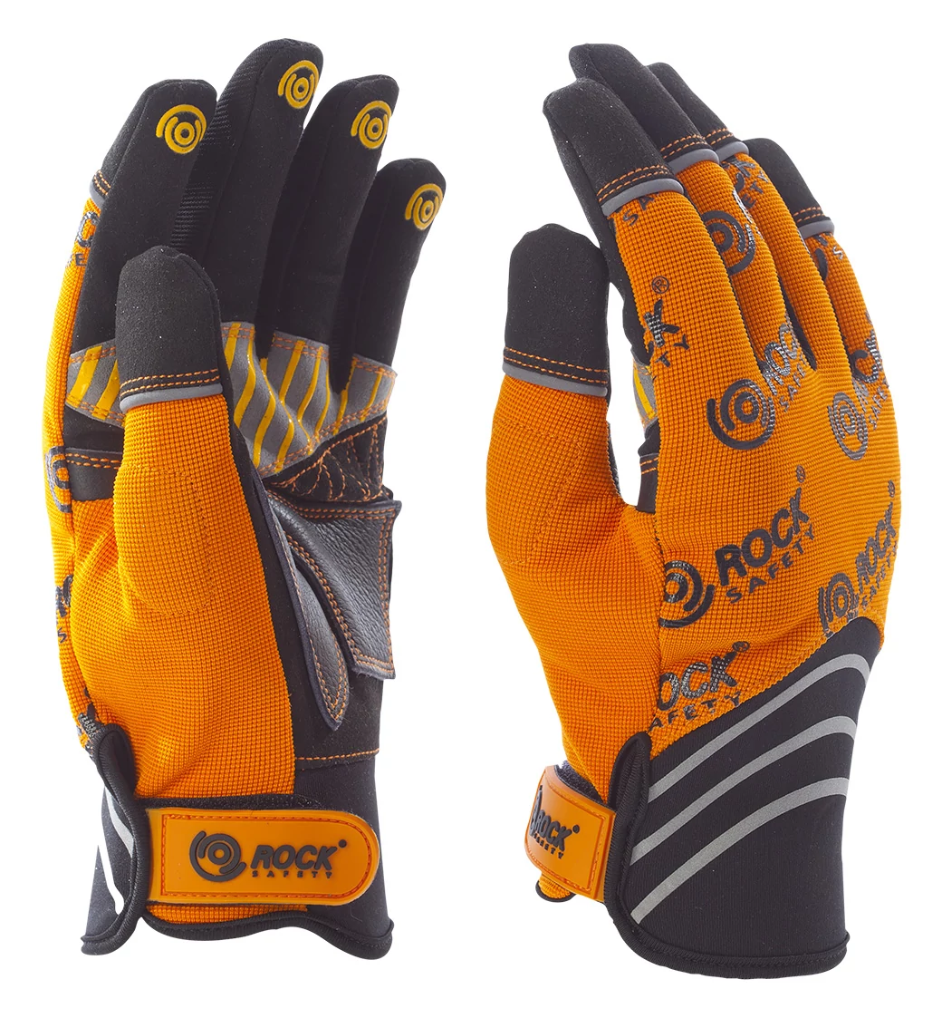 A csúszásgátló tenyér és ujjvégek megbízható tapadást nyújtanak még nedves vagy olajos felületeken is, míg a körömvédő kialakítás extra védelmet biztosít a kéz érzékeny pontjain. A narancssárga rugalmas kézhát nemcsak jól szellőzik, hanem növeli a láthatóságot is, különösen gyenge fényviszonyok között. A fényvisszaverő minták tovább fokozzák a biztonságot, míg a tépőzáras csuklórész biztos illeszkedést garantál.