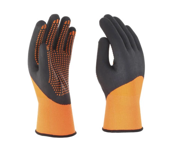 • Alapanyag: poliészter/spandex • Tűfinomság: 13 • Fekete, olajálló, habnitril mártás, ökölcsontig • Narancssárga, csúszásmentes PVC tenyérpontozás • Szín: narancs