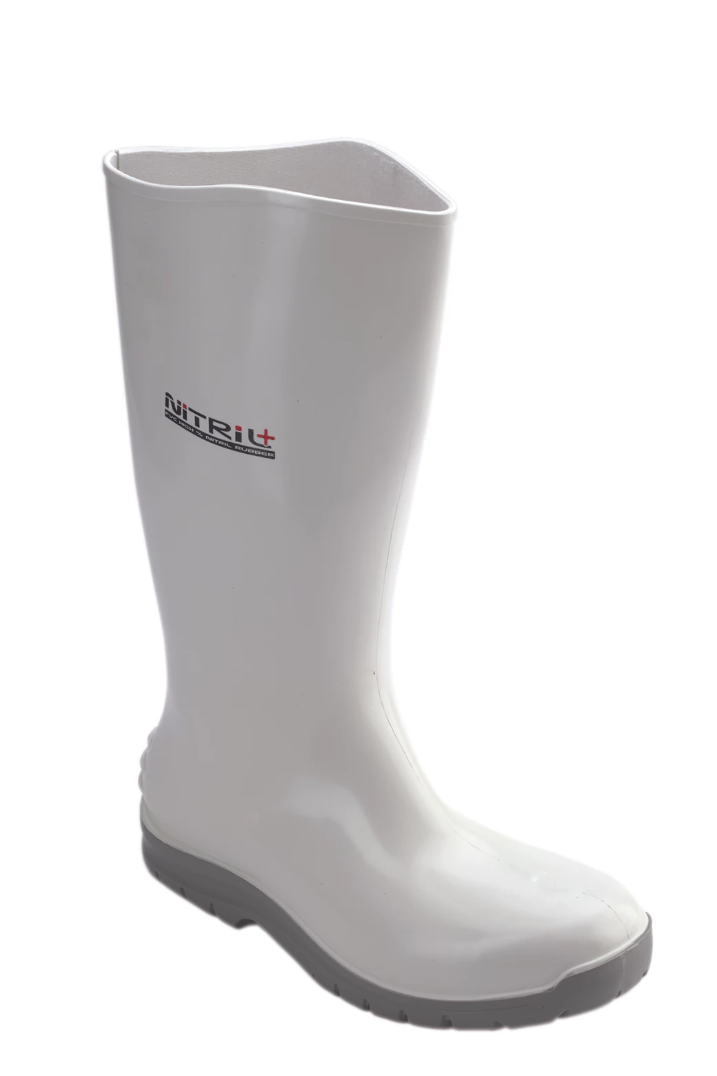 Nitril/PVC/gumi S4 csúszásmentes talpú csizma, fehér – kiváló választás ipari és munkavédelmi környezetben! Strapabíró PVC-nitril-kaucsuk felsőrész, amely ellenáll az állati és növényi zsíroknak. Acélkaplis (200 J) és antisztatikus talp maximális védelmet nyújt, míg a csúszásmentes PVC talp (SRC minősítés) stabil tapadást garantál. Vékony poliészter bélés kényelmes viseletet biztosít.