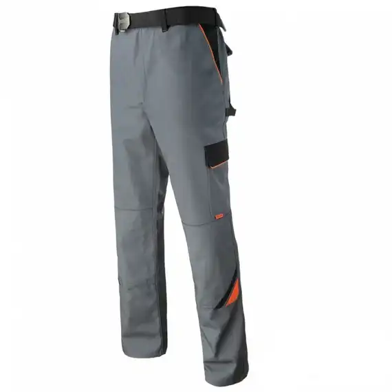 Alapanyaga: 65% poliészter és 35% pamut, 320 g/m2, Derekas kivitel, Sportos, profi munkaruha kialakítás, Többfunkciós oldalsó szerszámzseb, Tartós, színtartó kivitel, Szürke, fekete, narancs színösszetétel, Erősített térdfelület, Térdprotektor behelyezési lehetőség.
