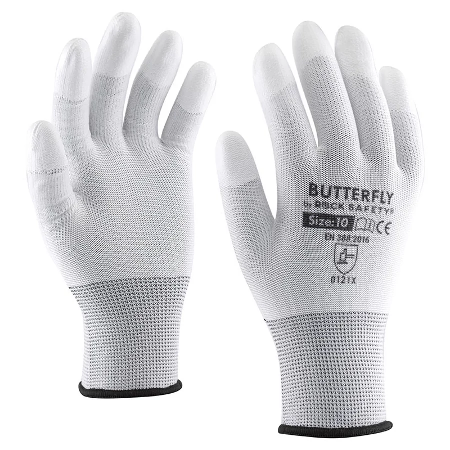 A BUTTERFLY poliészter szerelőkesztyű PU ujjvégmártással a finommechanikai munkákhoz tervezett kesztyű, amely ötvözi a precizitást, a kényelmet és a költséghatékonyságot. A fehér PU bevonat kizárólag az ujjvégeken található, így a kesztyű megőrzi légáteresztő tulajdonságait, miközben ott nyújt védelmet, ahol a legnagyobb igénybevétel történik.