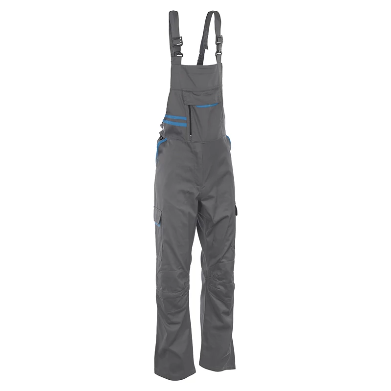 • Alapanyag: 65% poliészter, 35% pamut • Alapanyag súly: 250 g/m2 • 2 elülső ívelt svédzseb, 1 cipzáras mellzseb zsebfedővel, 1 tépőzáras mellzseb, 1 szerszámtartó zseb • 2 tépőzáras oldalzseb zsebfedővel • Állítható hosszúságú, gumírozott vállpánt és gombokkal állítható derék • Cipzáras slicc • Erősített dupla térdfolt • 60 °C-on mosható • Szín: szürke-világoskék