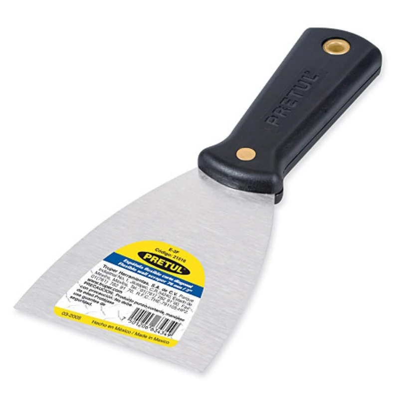 A SPAKNI RUGALMAS 3" E-3F PRETUL egy professzionális glettelő eszköz, amelyet festők és burkolók számára fejlesztettek ki. A strapabíró szénacél penge ellenáll a kopásnak és a mechanikai igénybevételnek, míg a teljes hosszúságú penge maximális szilárdságot biztosít.