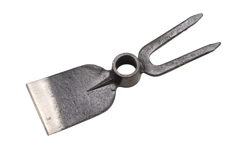 Kovácsolt hegyes villáskapa, amely hasznos a kerti munkák során.